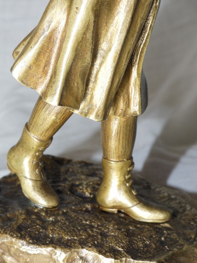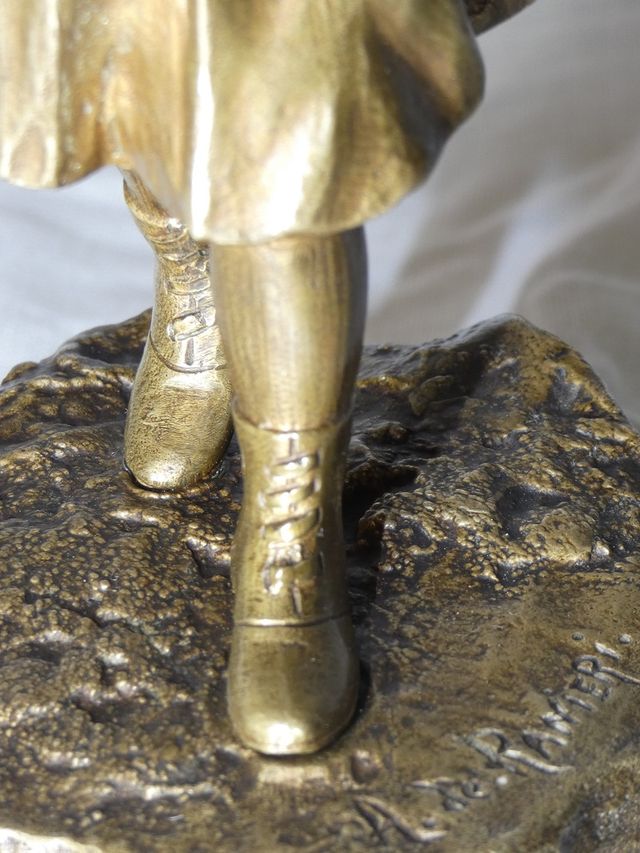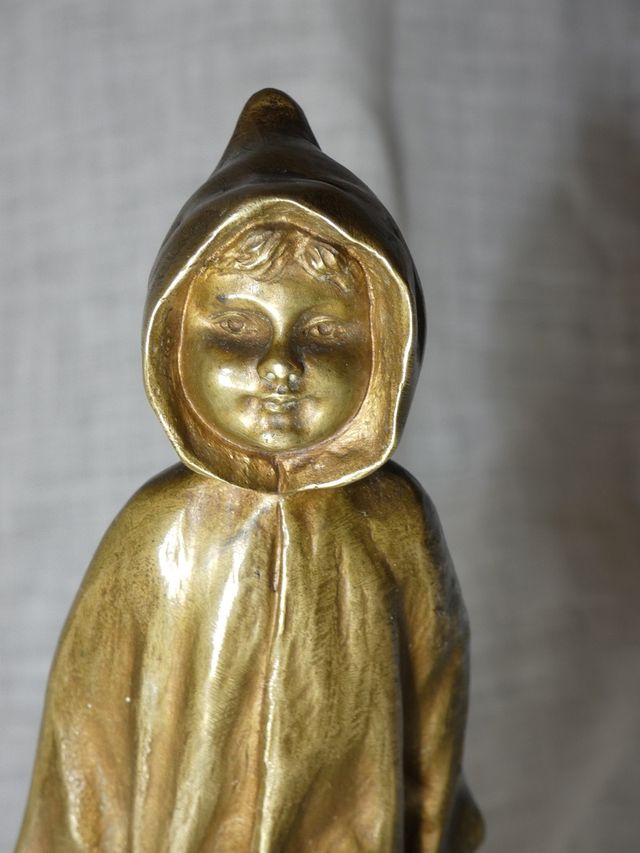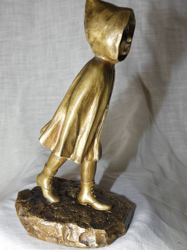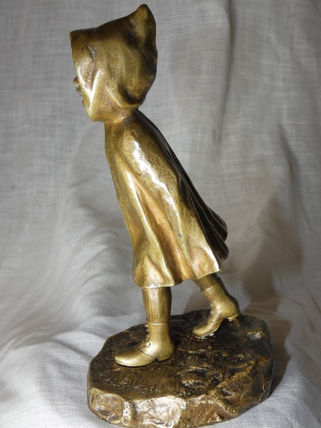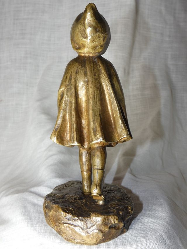 Charmant petit bronze patine doré représentant une jeune fille à la cape , peut être " le petit chaperon rouge " signé A.De RANIERI .