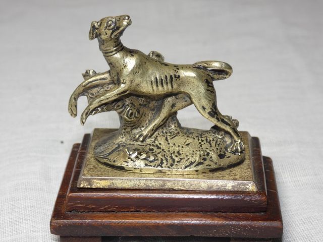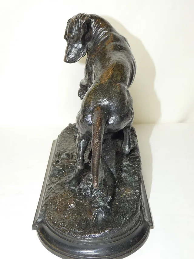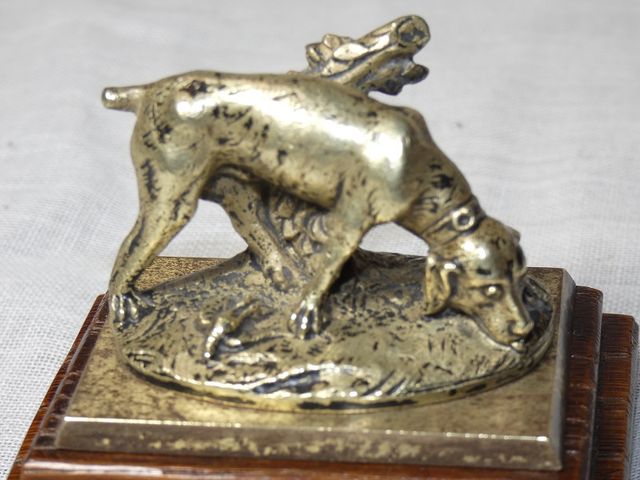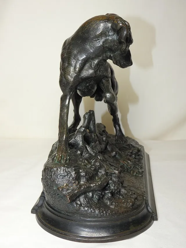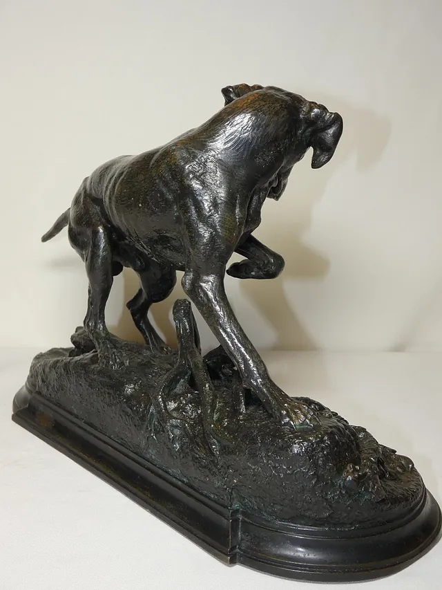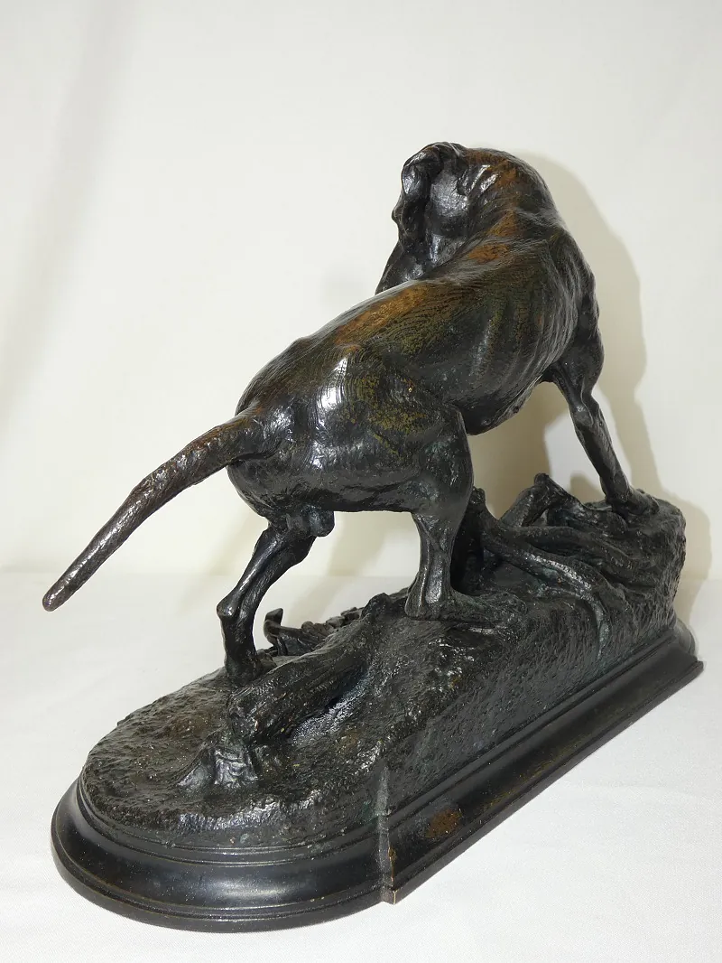 Très beau et rare bronze animalier ancien par Jules MOIGNIEZ, non signé, représentant un chien de chasse à l'arrêt sur un lézard sur une terrasse de présentation