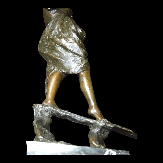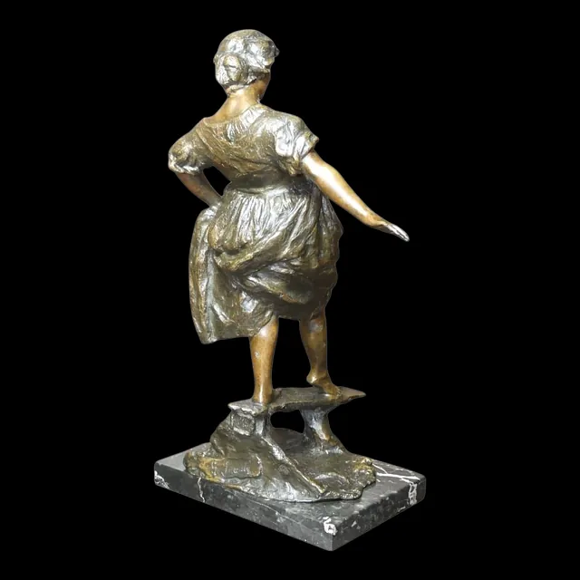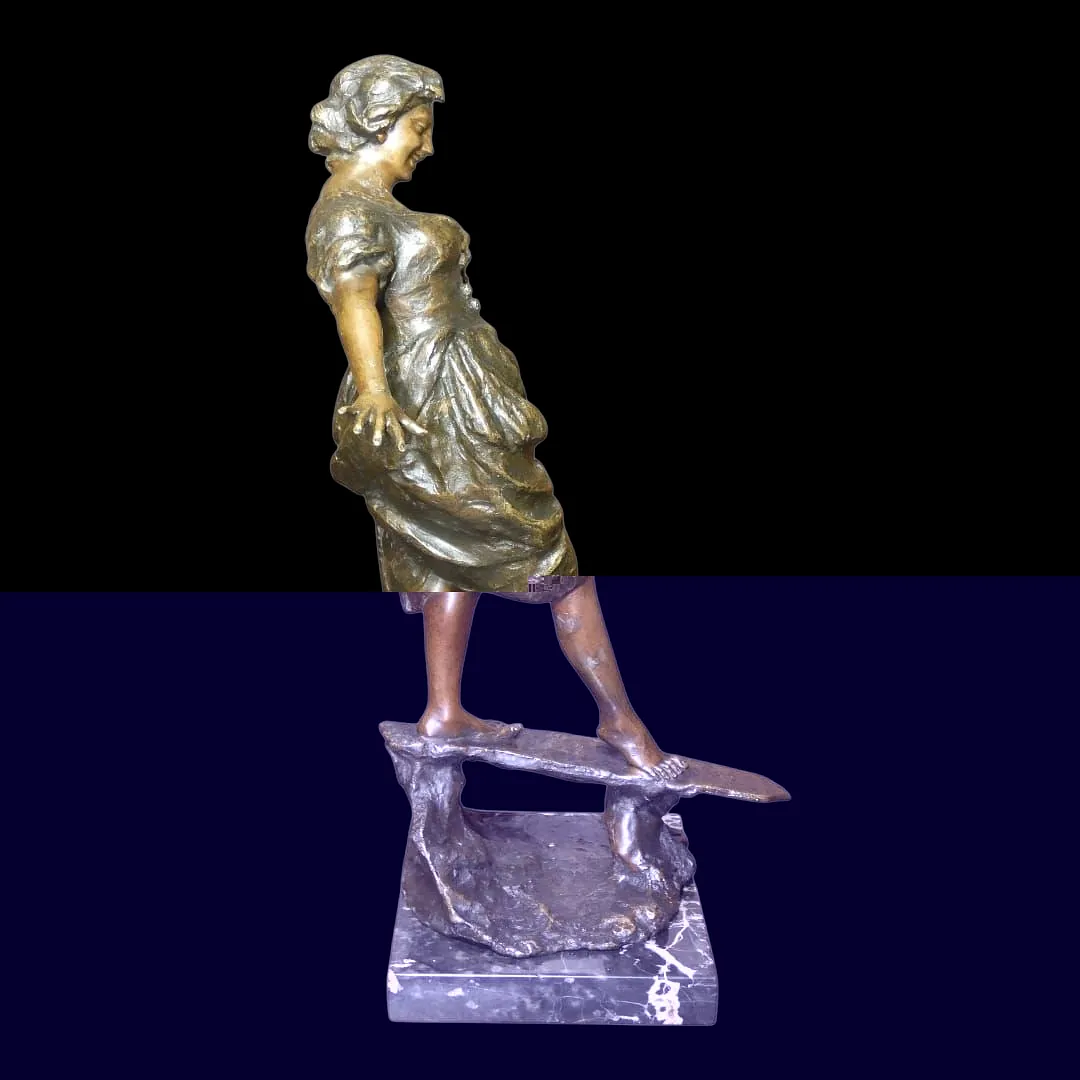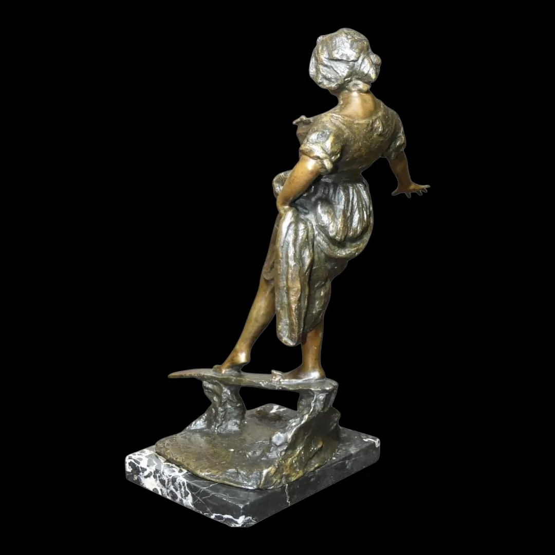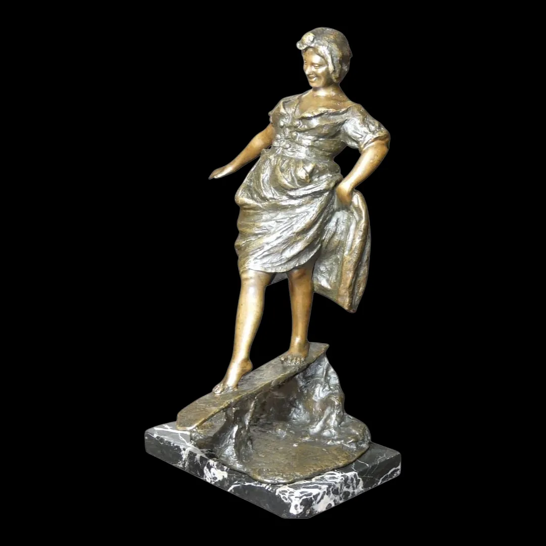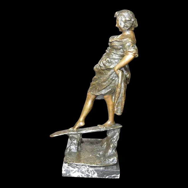 Sculpture représentant une jeune femme en équilibre sur une planche, traversant un ruisseau