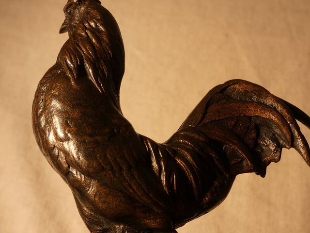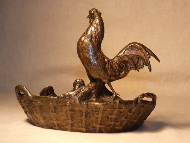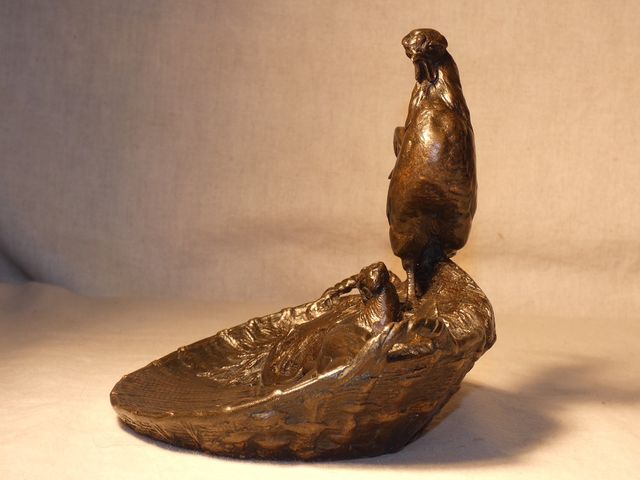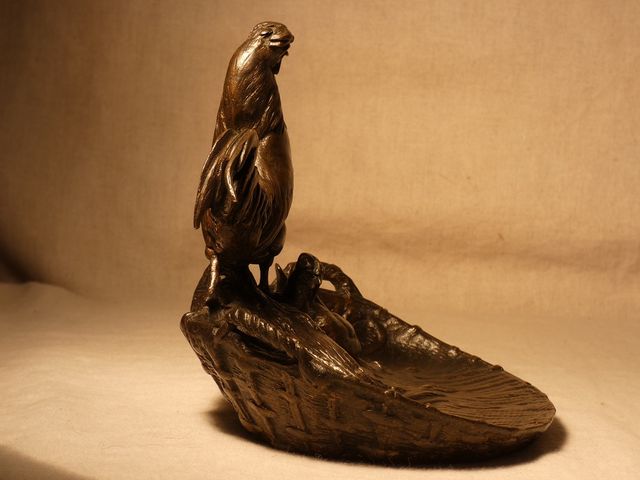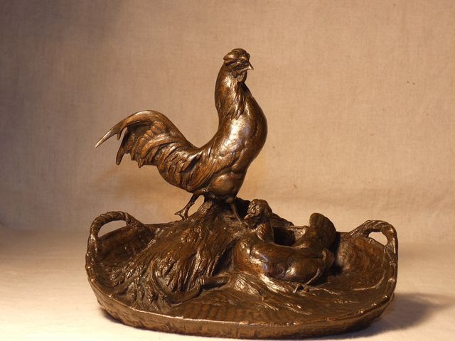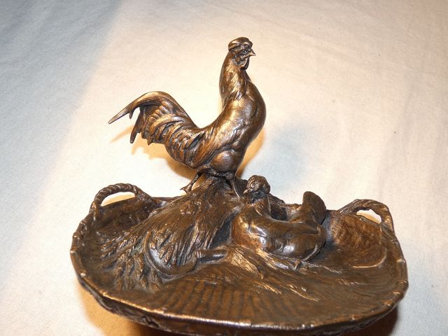 Vide poche en bronze à patine médaille, représentant un coq et sa poule en train de couver, signé Auguste CAIN (1821-1894).