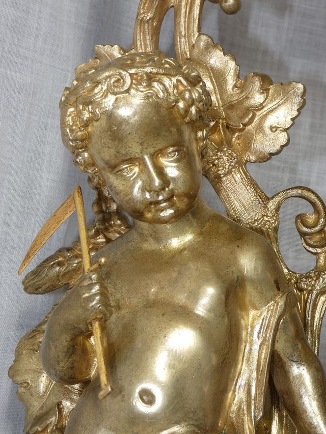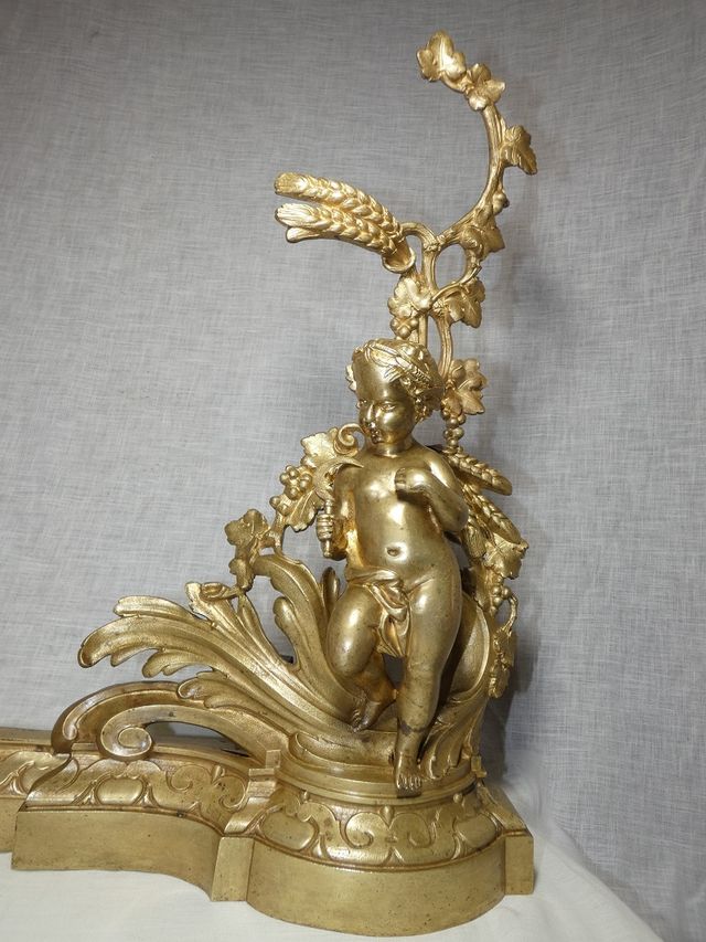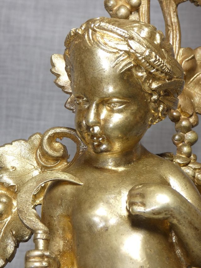 Superbe barre de cheminée en bronze ciselé et doré , représentant des bébés, l'un vendangeur et l'autre moissonneur , dans le goût de Ferdinand BARBEDIENNE .