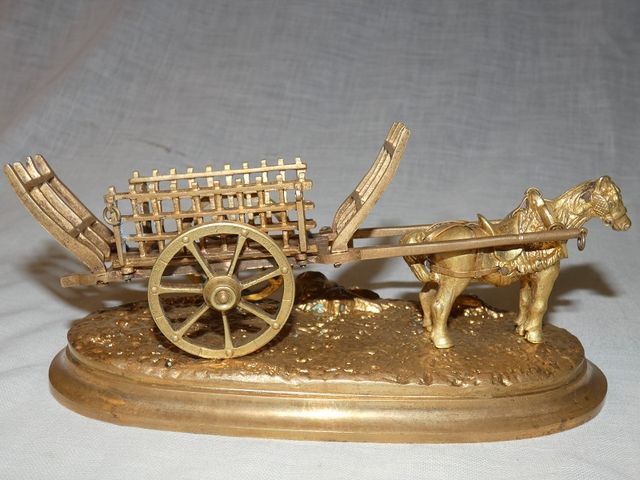 Statue en bronze doré datant du 19 ème siècle représentant un cheval de trait et sa charrette, en très bon état .